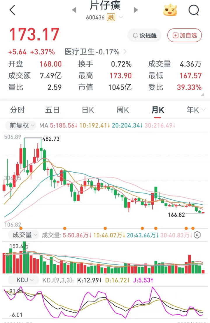 但是这并不是终点,在一些主流的电商平台上,片仔癀实际的成交价,仅仅只需要590 元即可购得,而且还有价格继续走低的趋势。这个590元的价格是2020年片仔癀的指导价格,其实这还算好到,因为片仔癀的股价,其实跌的更多,在这近四年已经跌去了近2/3,从最高点的每股480元,到现在的173元。
